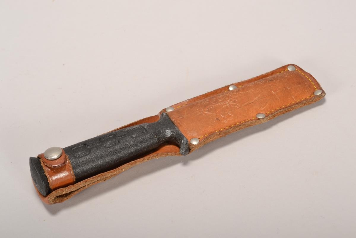 Skátahnífur og slíður. Hnífurinn er með svörtu plastskafti en slíðrið er úr dröppuðu leðri, hægt að festa á belti.