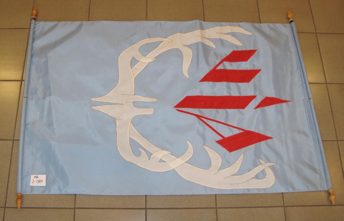 UÍA fáninn. Er á járnstöngum ofan og neðan og eru tréhnúðar á endum stanganna. Rauðir stafir, hvít hreindýrshorn á ljósbláum grunni. Var notaður við Alþýðuskólann á Eiðum. Kom vorið 1984.