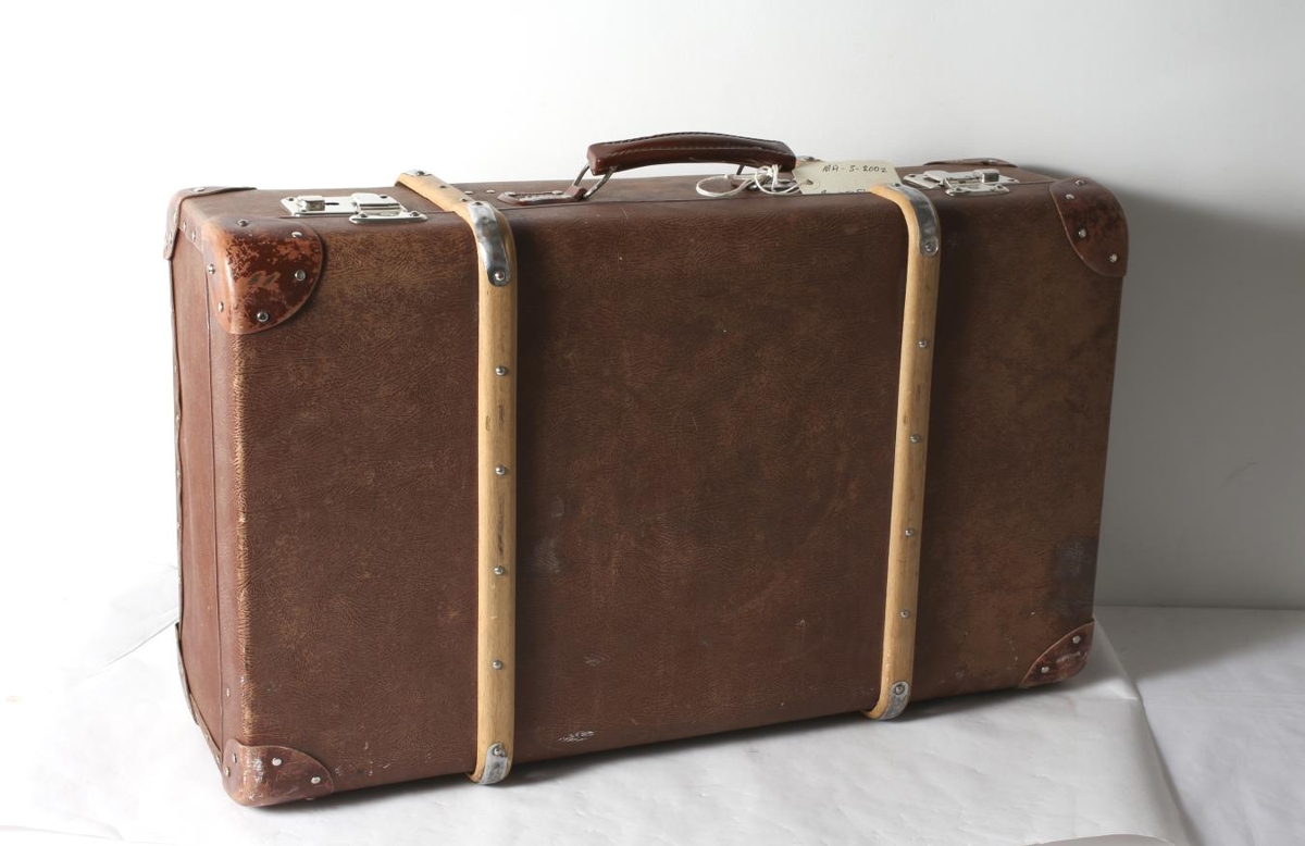 Brún ferðataska úr pappa og tré. Úr dánarbúi Jónínu Vilborgar Jónsdóttur og Runólfs Jónssonar, Litla Sandfelli í Skriðdal.