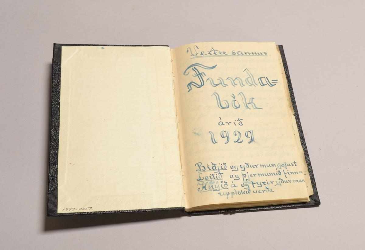 Fundarbók árið 1929. Lítið kver með svörtum, hörðum spjöldum og svörtum kili. Á titilsíðu er skráð: Vert sannur Fundarbók árið 1929. Bókin er með uppritunum af miðilsfundum árið 1929 og þá líklega af fundum Sálarrannsóknarfélags Íslands. Allir fundirnir voru á laugardögum og virðast hafa byrjað líkt og messugjörð áður en miðillinn hóf upp raust sína.