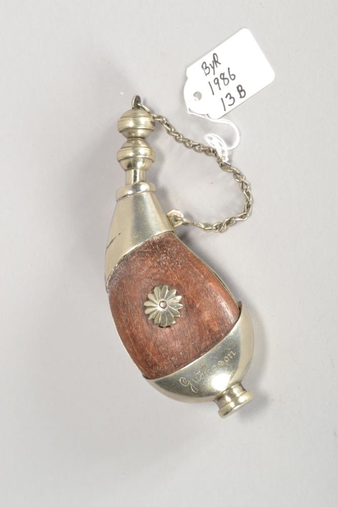 Silfursleginn tóbaksbaukur, tóbaksponta, úr dökkum harðviði með áletruninni „Guðleifur 1932 Guðnason“. Baukur þessi var gjöf til afa frá nýfæddum nafna og foreldrum hans.