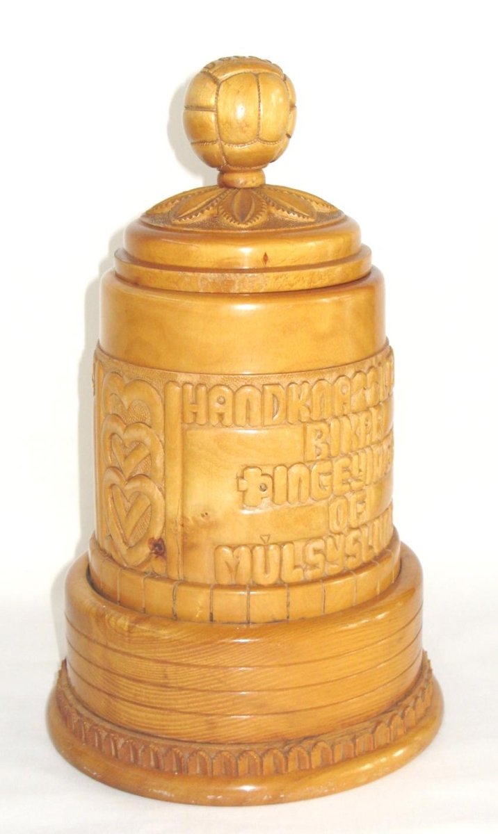 Renndur, útskorinn bikar úr birki. Útskorin lesning: "Handknattleiksbikar Þingeyinga og Múlsýslunga". Verðlaunabikar á handknattleiksmóti stúlkna á