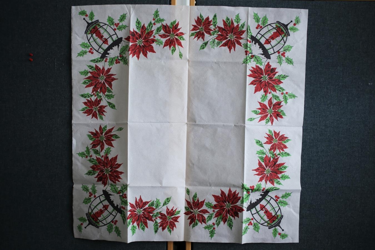 Hvítur dúkur með áprentuðum kanti allan hringinn. Jólarósir og kertalukt er myndefnið. Luktirnar eru í hornunum. Var í eigu Sigríðar Jóhannsdóttur Kröyer og Sveins Guðmundssonar rafvirkjameistara.