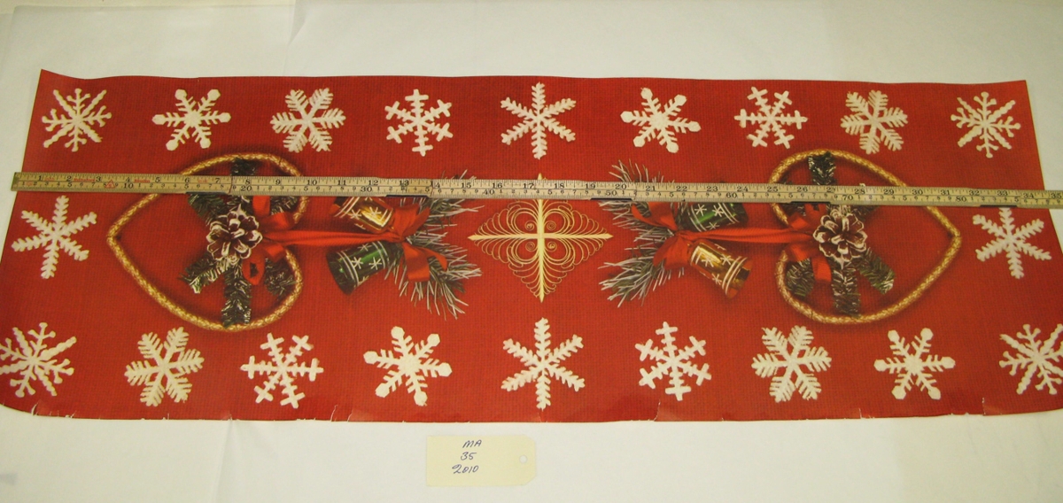 Tveir rauðir renningar úr pappír með áþrykktum myndum af jólabjöllum, hálmhjarta og greinum með könglum. Var í eigu Sigríðar Jóhannsdóttur Kröyer og Sveins Guðmundssonar rafvirkjameistara.