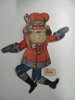 Jólasveinn, sprellikarl. Í rauðri treyju, bláum buxum og bláum stígvélum með loðkanti. Með skíði og fleira dót á bakinu, bréf í treyjunni og íslenska fánann í sitthvorri hönd. Úr búi Sigríðar Jónsdóttur frá Litla-Steinsvaði. Skrautmunur.