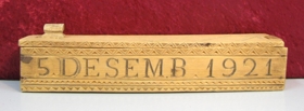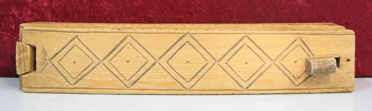 Prjónastokkur úr furu. Lok útskorið m/ tíglamunstri ofan á, en V munstri á hliðum. Lás á loki og járnplata sem gengur inn í sæti á stokknum. Á hlið stokksins er skorið út "5. desember 1921" og "Halldóra S.D." ( stendur fyrir Sigurðardóttir). Á endanum er fjögurra blaða rós. Hallur Sæmundsson bjó líklega til stokkinn. Hallur og kona hans, Katrín Pálsdóttir, voru í húsmennsku að Hallfreðarstöðum. Hallur og Eiríkur bóndi voru tvíburabræður. Eiríkur var faðir Vigfúsar manns Sigríðar Jónsdóttur sem gefur stokkinn Gaman væri að vita af hverju 5 desember 1921 er skorið á stokkinn, því Halldóra var fædd 14. janúar 1879. Kannski brúðkaupsdagur?