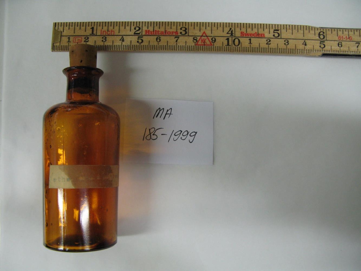 Brúnt lyfjaglas með korktappa. Vélritaður miði er á glasinu sem á stendur: "Ætherolevm citronellæ". Innihaldi fargað. Glasið er fengið frá Lyfjaverslunarsafninu í Reykjavík.