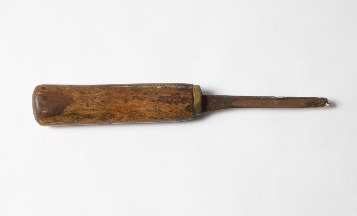 Hnífur, búinn til úr rennijárni, skaftið er sprungið báðum megin. Úr búi Guðna Jónssonar, smiðs á Eskifirði (f.1891 d.1975).