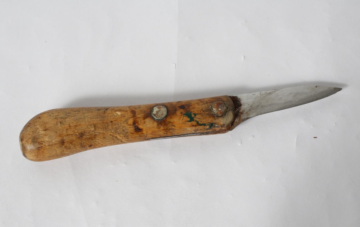 Hnífur með tréskafti og stuttu blaði. Úr búi Guðna Jónssonar, smiðs á Eskifirði (f.1891, d.1975).