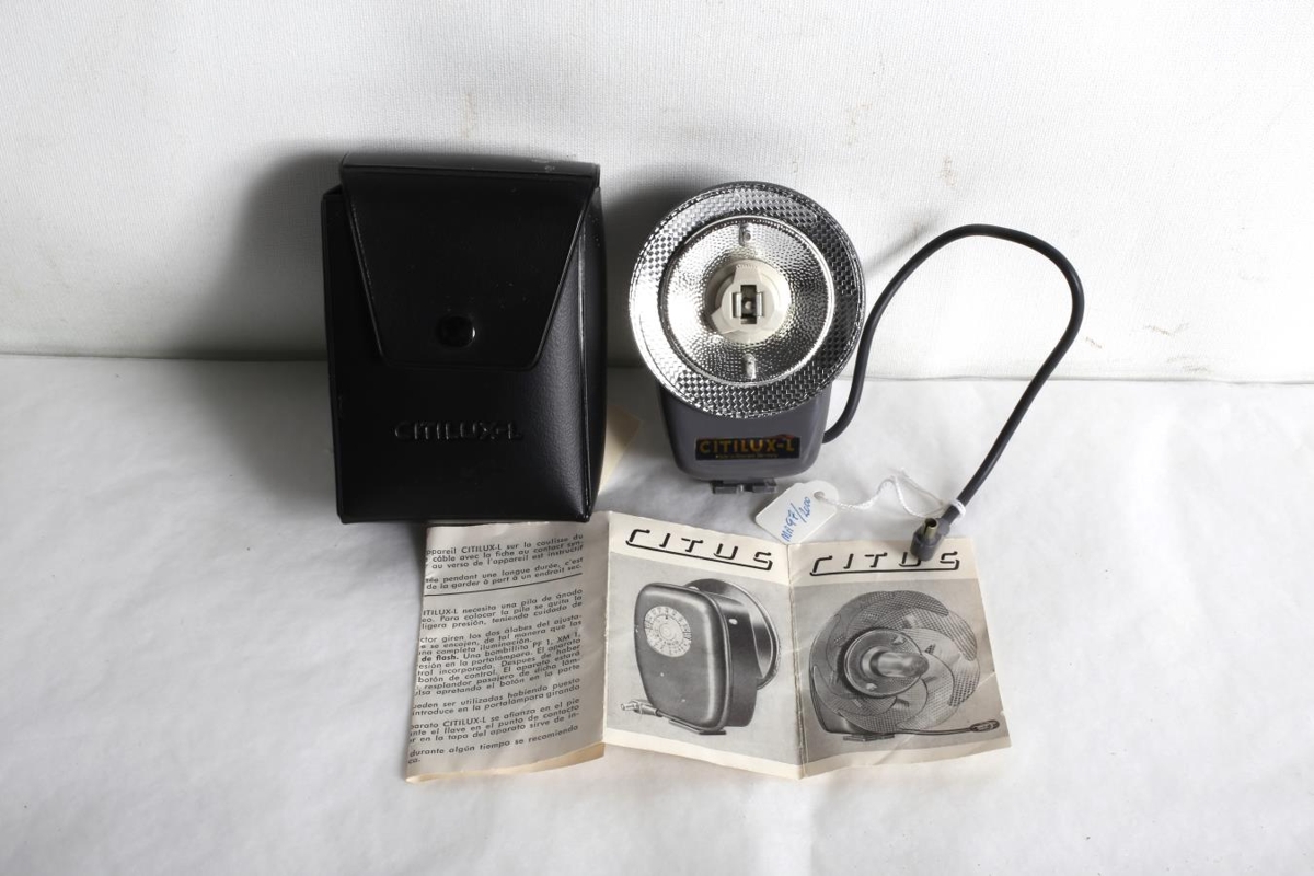 Grátt peruflass, af gerðinni Citilux - L, með hringlaga silfruðum skerm. Perur vantar. Flassið er í svörtum plastumbúðum, leiðbeiningar fylgja. Flassið mun vera frá um 1970. Gefandi átti og notaði hlutinn. Annað heiti: Blossaljós eða flass.