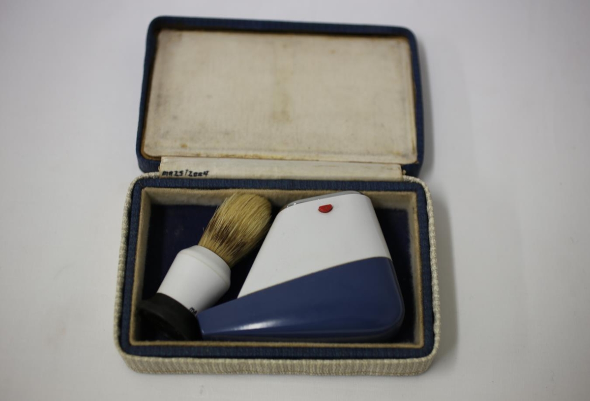 Rakvél og bursti í tösku - vantar rafmagnssnúru með vélinni. Vélin er af gerðinni Philips. Made in Holland. Burstinn er af gerðinni Gillette Standard. Made in England. Taskan er blá og hvít. Úr dánarbúi Gunnsteins Stefánssonar (f.23.06.1930, d. 10.01.1986), vatnamælingamanni frá Ekru og Huldu Jónsdóttur (f. 15.04.1931, d. 06.02.2004) húsmóður frá Freyshólum, sem bjuggu á Selási 5 á Egilsstöðum (Hulda var afasystir gefanda).