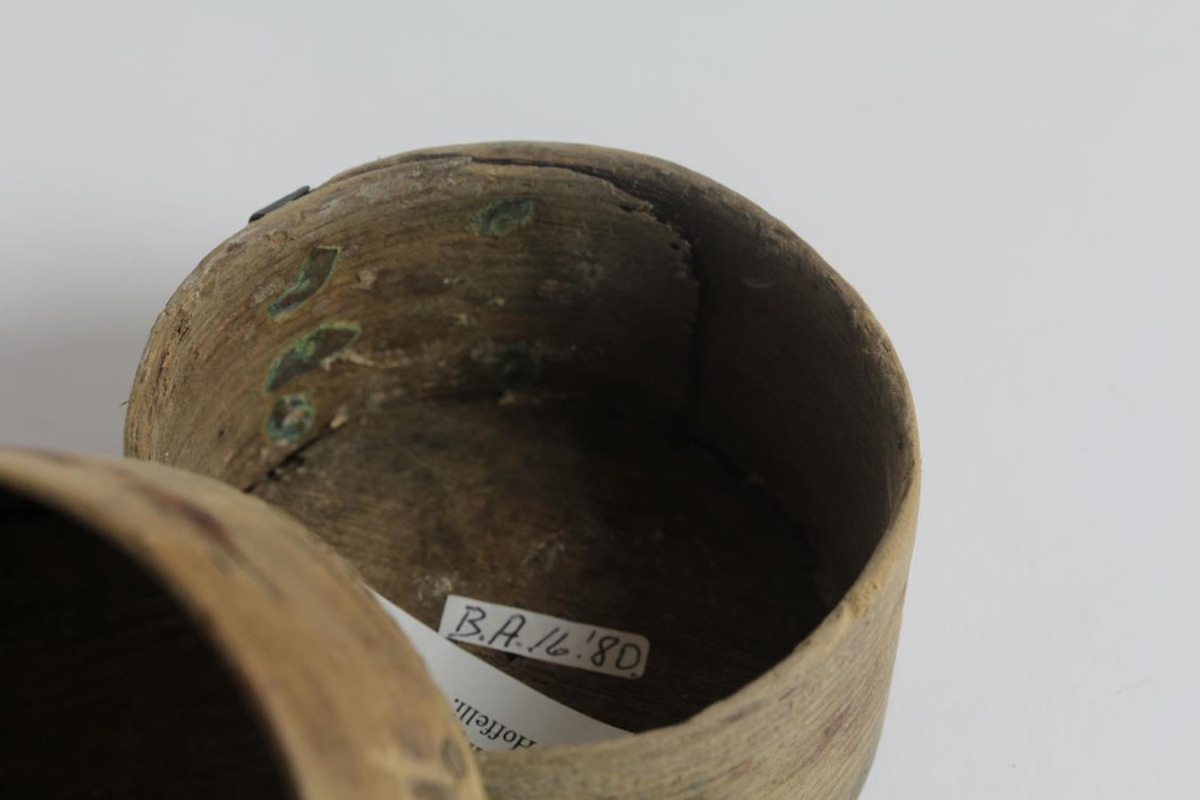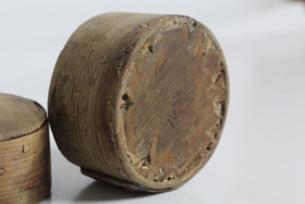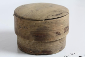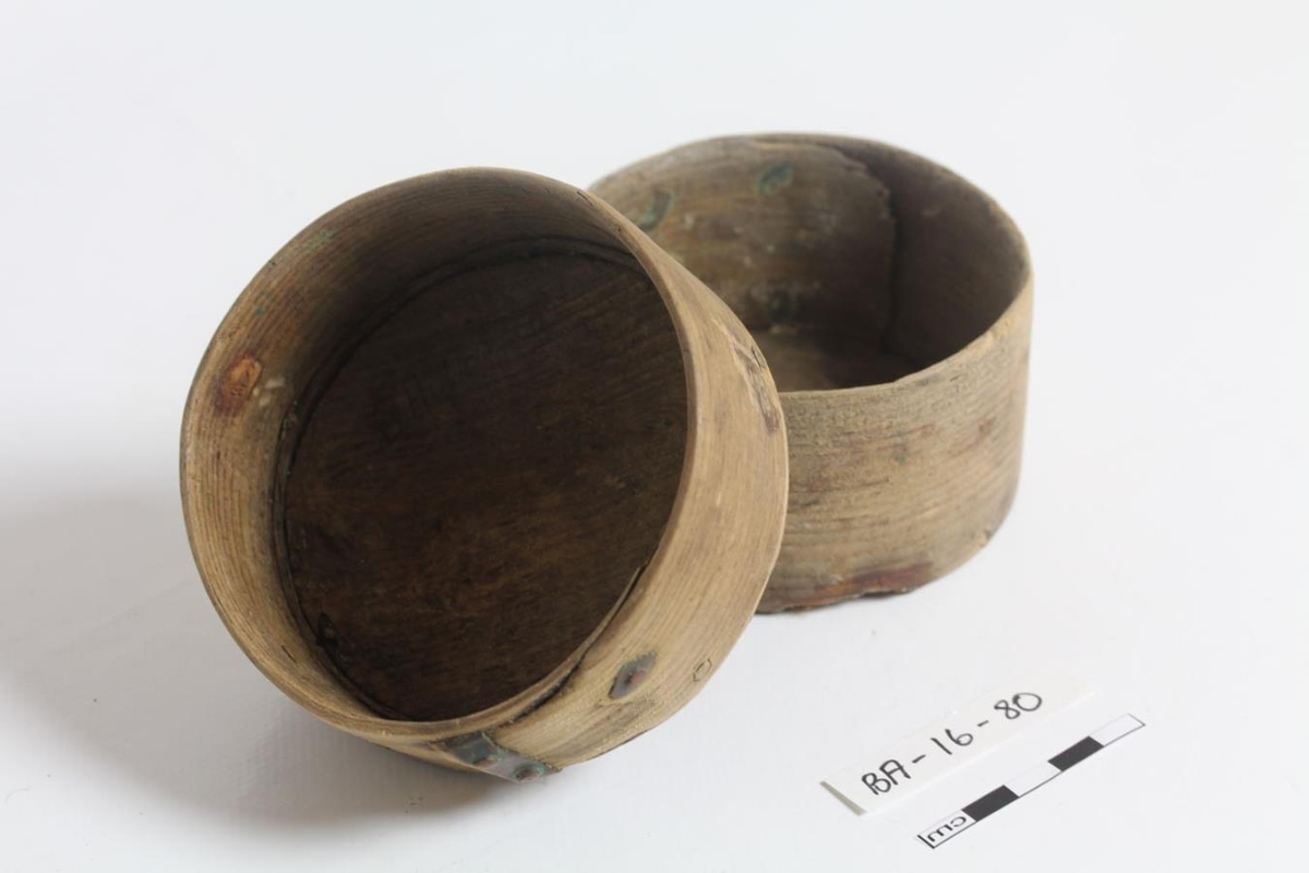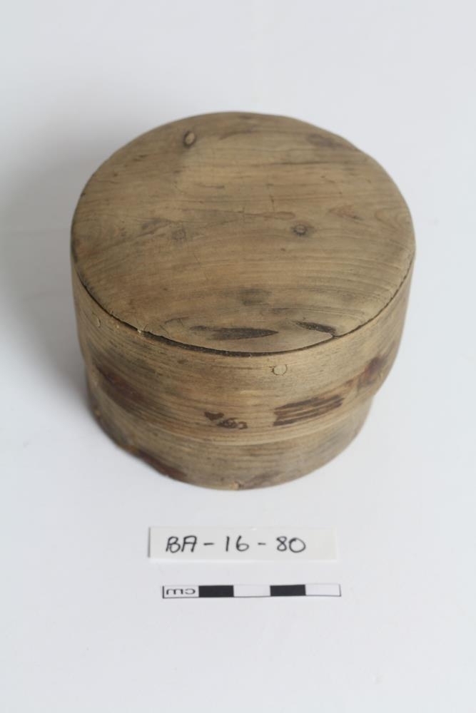 Smjöraskja m. loki, lítil. Spengd og fest með CO/AU festingum. Farið að kvarna úr botninum.