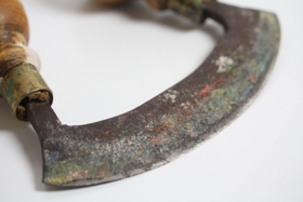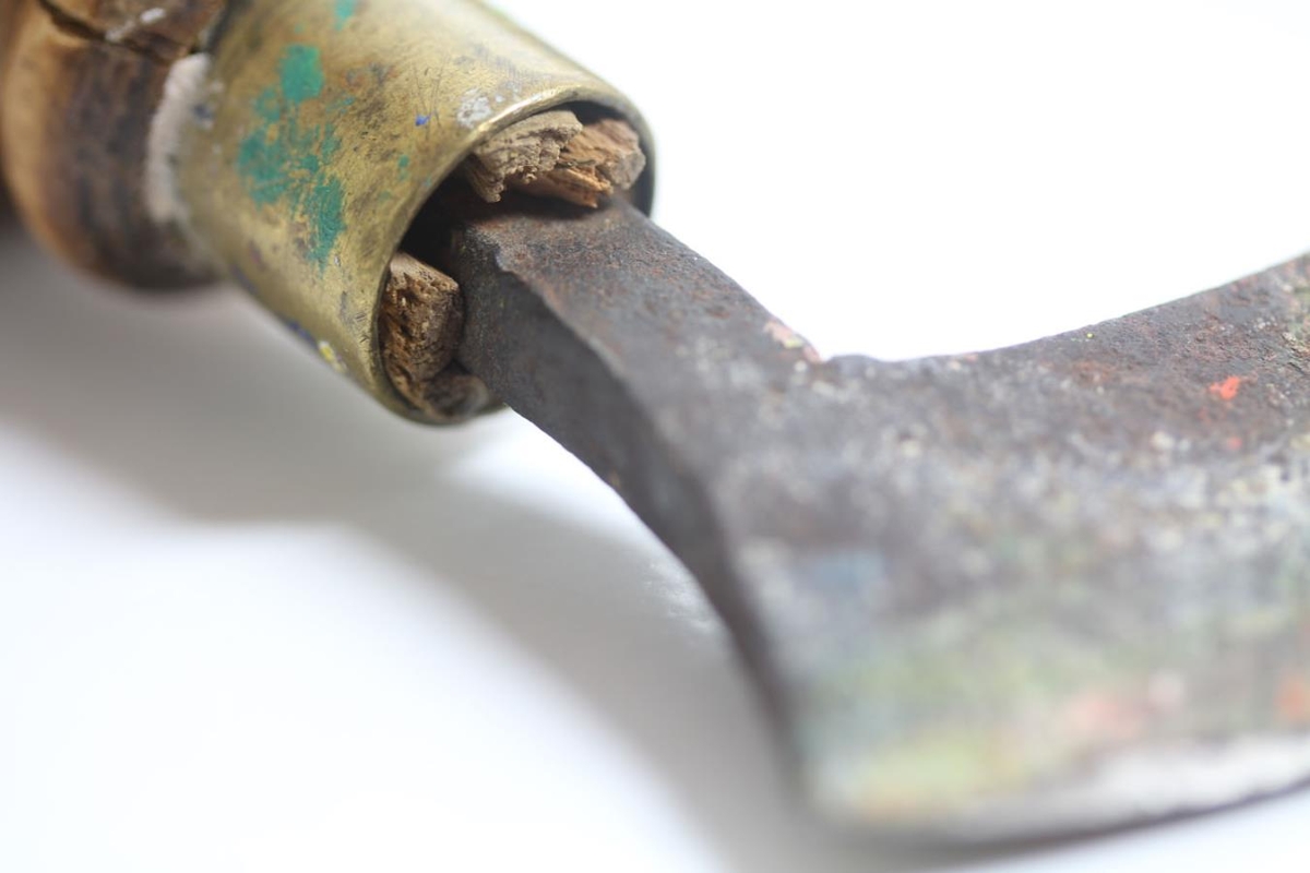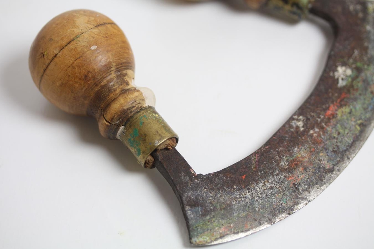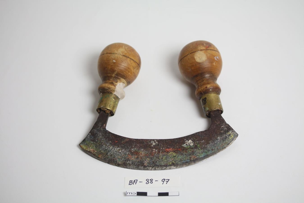 Upphaflegur eigandi var Þórður Guðmundsson, afi Svavars. Handföng úr við, járnið sjálft fest við handföngin með CO/AU gjörðum.