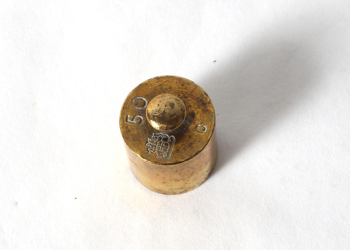 Kringlótt lóð, 50 gr., með hnúð að ofan. Ofan á er grafið skjaldarmerki og talan 50. Neðan á er einnig grafið skjaldarmerki og ártalið 1948. Kom frá tilraunabúinu á Skriðuklaustri. Fylgir vigt MA-2019-286.