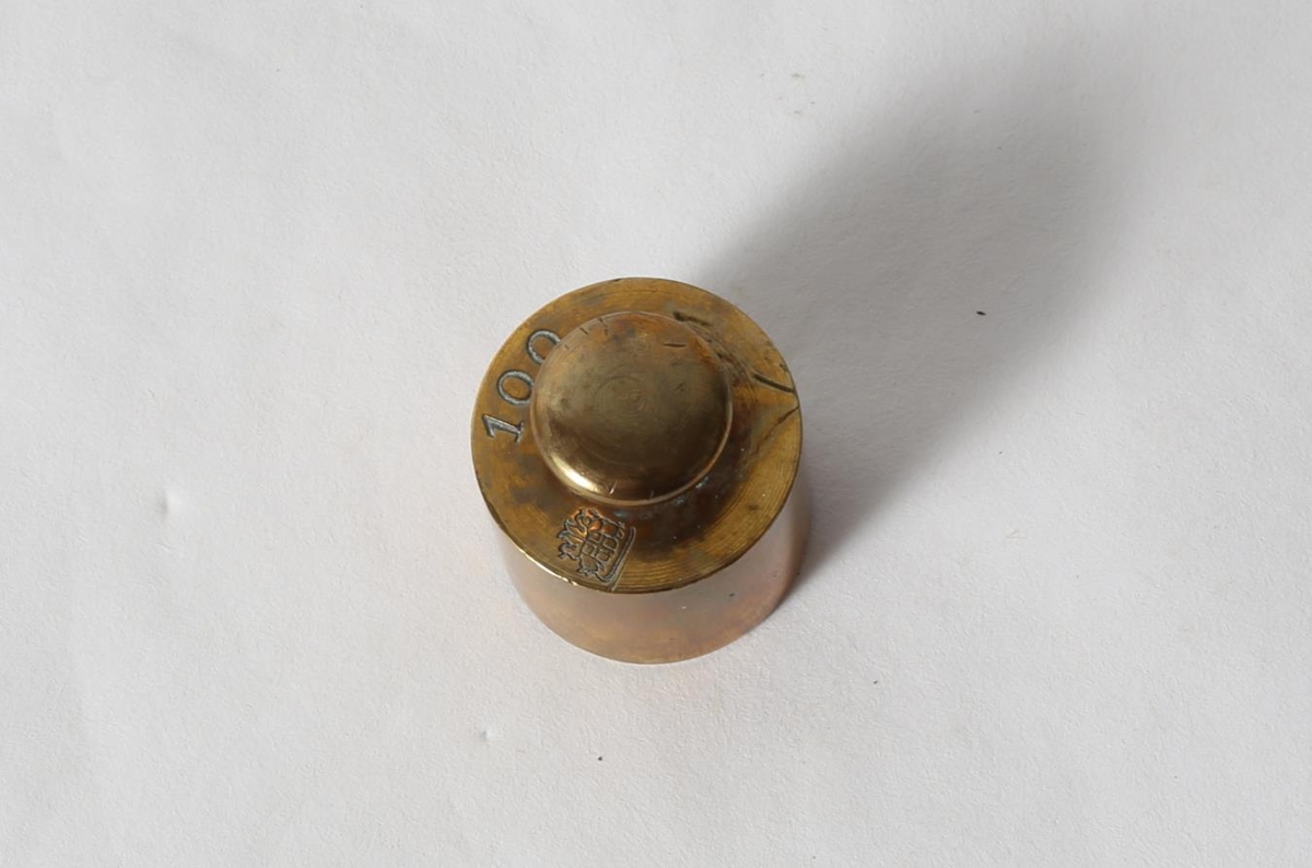 Kringlótt lóð, 100 gr., með hnúð að ofan. Ofan á er grafið skjaldarmerki og talan 100. Neðan á er einnig grafið skjaldarmerki og ártalið 1955. Kom frá tilraunabúinu á Skriðuklaustri. Hefur hugsanlega fylgt með eldri safngripum sem voru þar í geymslu. Fylgir vigt MA-2002-185.