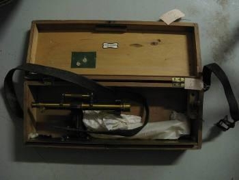 Kassi ómálaður, tæki svört og eirlituð. Mælitæki með kíki og hallamáli ásamt fylgihlutum í trékassa með axlaról, þrífótur fylgir. Til landmælinga. Jón