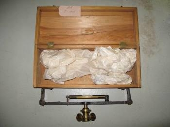 Mælitæki til landmælinga með hallamæli í trékassa.