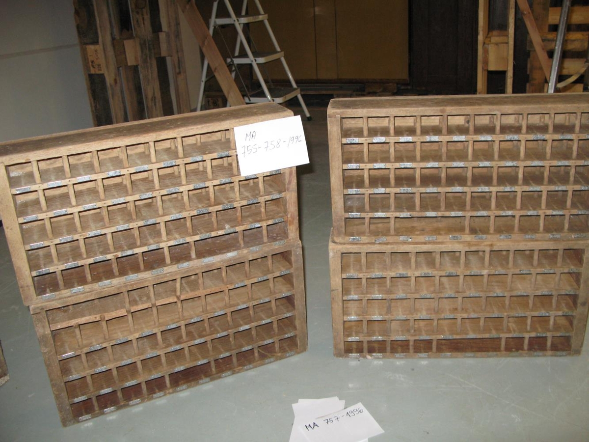 Trékassi með 50 hólfum, merktum með álplötu 100-150. Skemmdur. Úr mjólkurstöð KHB.