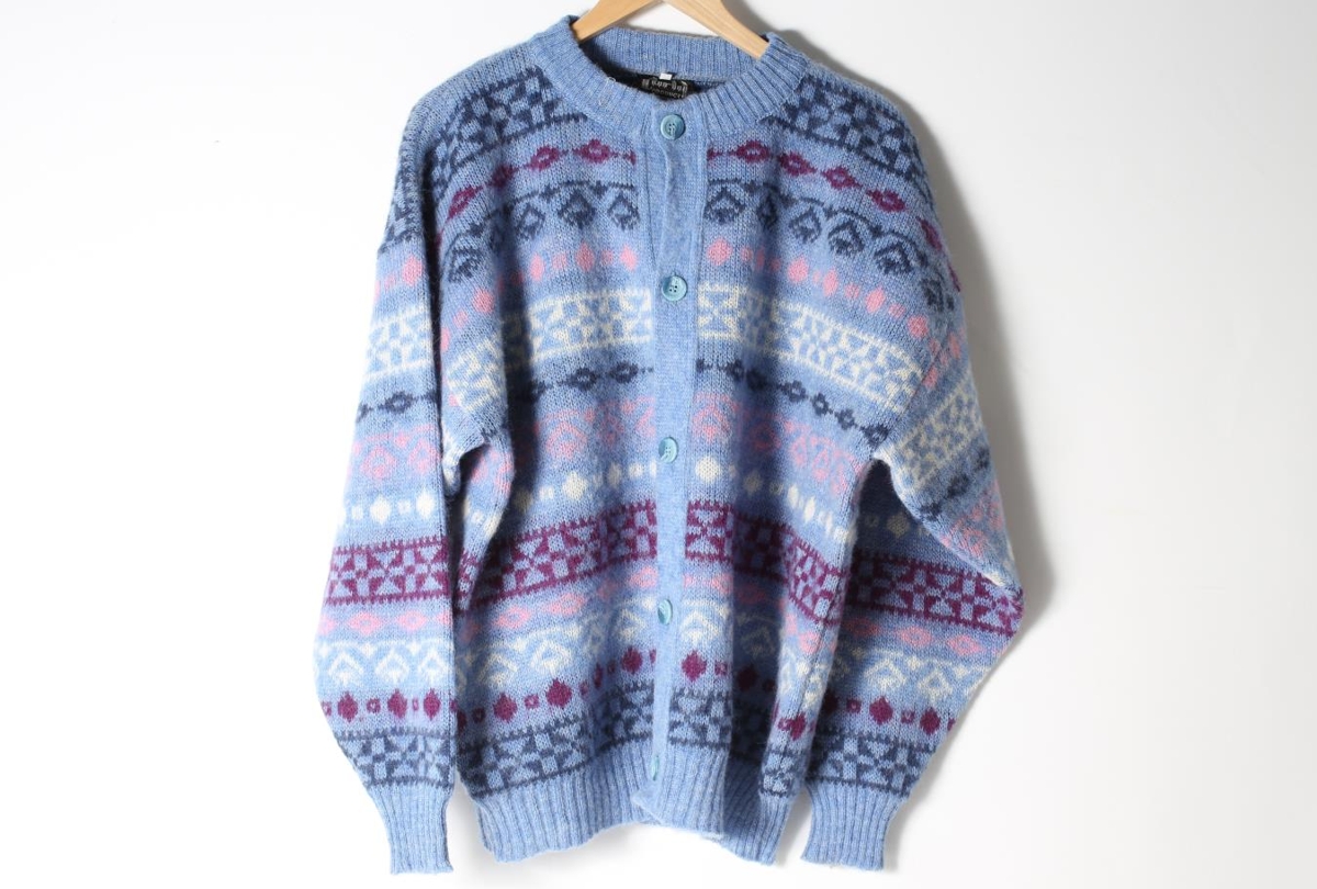 Vélprjónuð hneppt peysa. Litir, ljósbláir, dökkbláir, fjólubláir, bleikir og hvítir. Bekkjótt munstur. Peysan var framleidd í prjónastofunni Dyngju á
