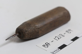 Handfang úr við, oddurinn úr járni. Eilítið riðgaður.