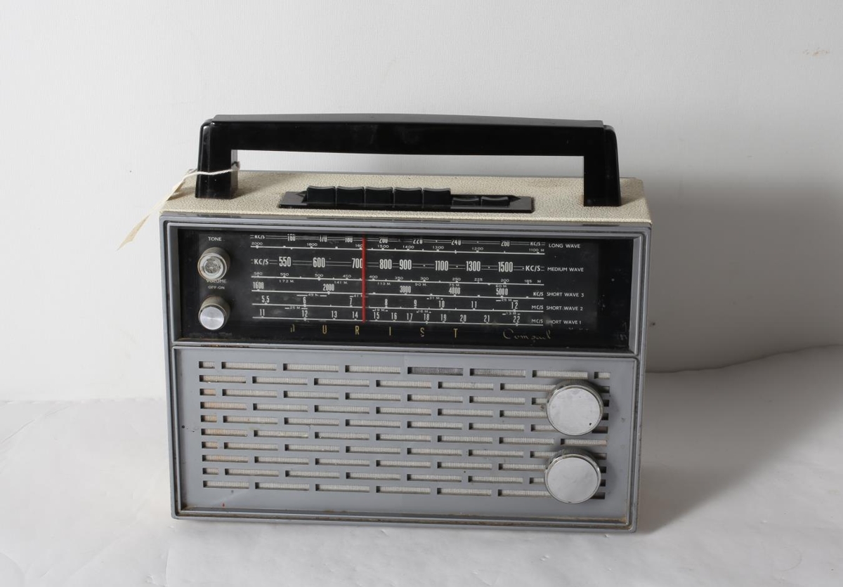 Ljóst lítið ferðaútvarp með svörtu haldi, tökkum og skjá sem á stendur "Aurorist Compact". Aftan á stendur "Klarad Electronics, Oslo. Model41017." Úr eigu Þorbjörns Bergsteinssonar.