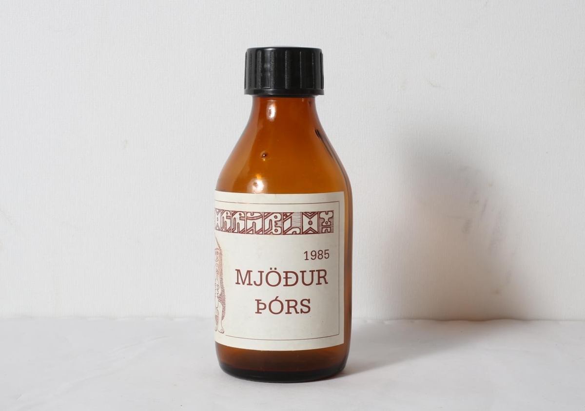 Lítil brún flaska (150 ml) með svörtum plast tappa og hvítum álímdum miða sem á er prentað með brúnu: "1985 Mjöður Þórs" ásamt mynd af Þórs-líkneski sem heldur á flösku í stað hamars. Efst er mynstur sem gætu verið rúnir. Flaskan er frá Þorrablótinu á Egilsstöðum 1985.
