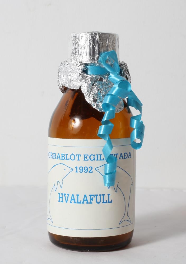 150 ml brún flaska með hvítum álímdum miða sem á er prentað í bláu: "þorrablót Egilsstaða 1992" og "Hvalafull". Auk þess eru myndir af tveimur hvölum. Tappinn er hulinn með álpappír og um háls flöskunnar er bundinn blár borði. Frá þorrablótinu á Egilsstöðum 1992.