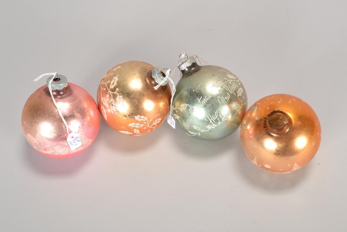 Glansandi jólakúlur úr plast ,gul, bleik, blá, og gyllt á litinn og með hvítu munstri