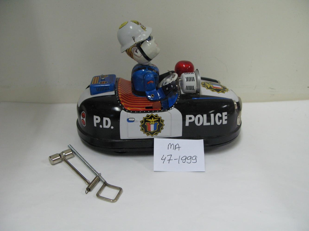 Svartur og hvítur leikfangalögreglubíll í upprunalegum kassa. Batteríisbíll með blikkljós.
