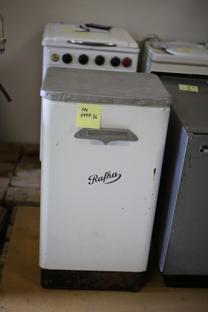 Hvít Rafha rafmagnsþvottavél með vindu. Var í eigu Sigríðar Zophoníasdóttur á Eiðum.