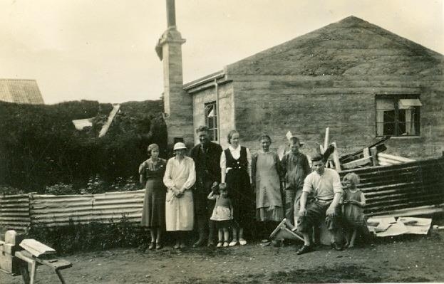Stóra-Hof í Gnúpverjahreppi. Sjö fullorðnar manneskjur og tvö ung stúlkubörn standa framan við bæinn. Brynjólfur Melsted þeirra á meðal.