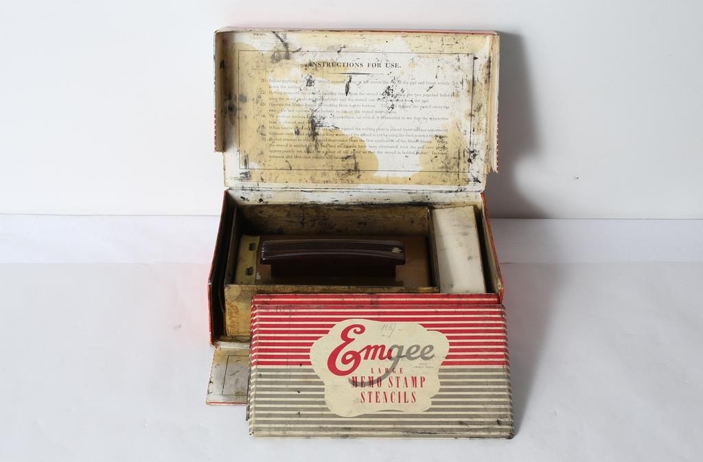 Stimpill með stenslum og bleki og pensli í rauðröndóttum pappakassa. Úr eigu Þórarins skólastjóra á Eiðum. Þórarinn keypti um 1960 og notaði til fjölritunar í skólanum. Þórarinn gaf tengdasyni sínum Hans-Uwe til að nota við kennslu á Eiðum, sem aldrei var.