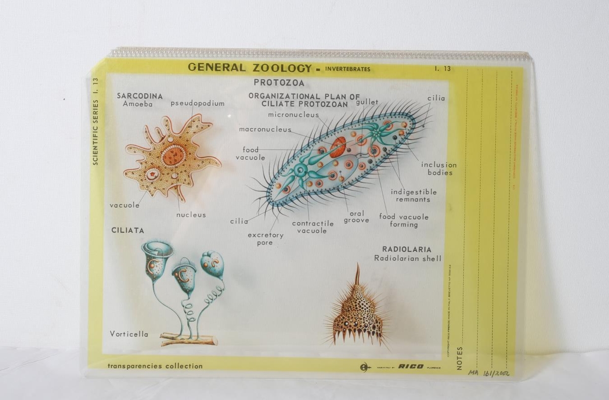 Glæra til kennslu í náttúrufræði. Glæran heitir: "General Zoology invertebrates Protozoa I.13" Lýst er einhverju sem helst líkist frumum eða amöbum (einfrumungum). Textinn er á ensku. Hægt er að fletta glærunni í sundur og sýna fyrst myndirnar. Frá Alþýðuskólanum á Eiðum.