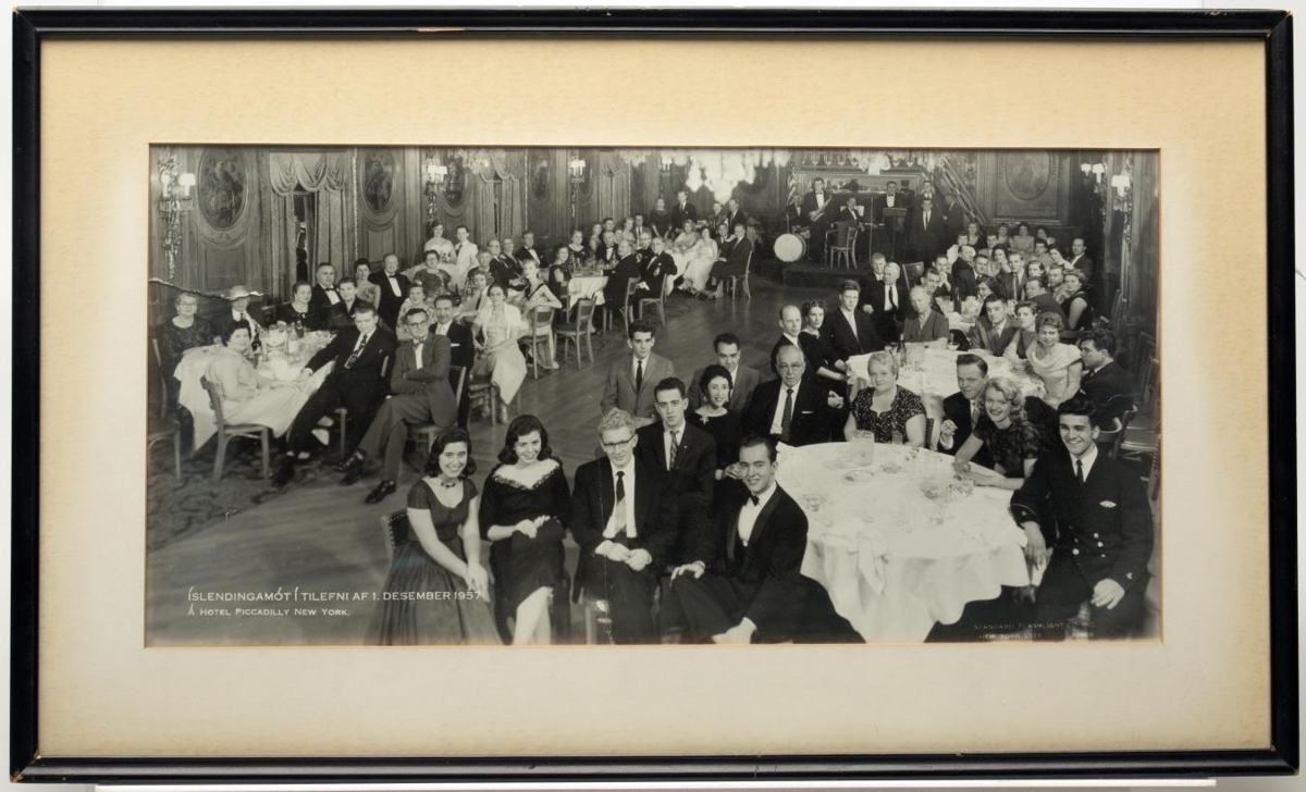 Hópur fólks sitjandi við hringborð í sal með hljómsveit. Auk þeirra sem skráðir eru í nafnaskrá gætu Árni Ólafsson og Stella Marteinsdóttir, Bjarni Magnússon og kona hans húsmæðrakennari verið á myndinni líka. Myndin er í svörtum ramma.