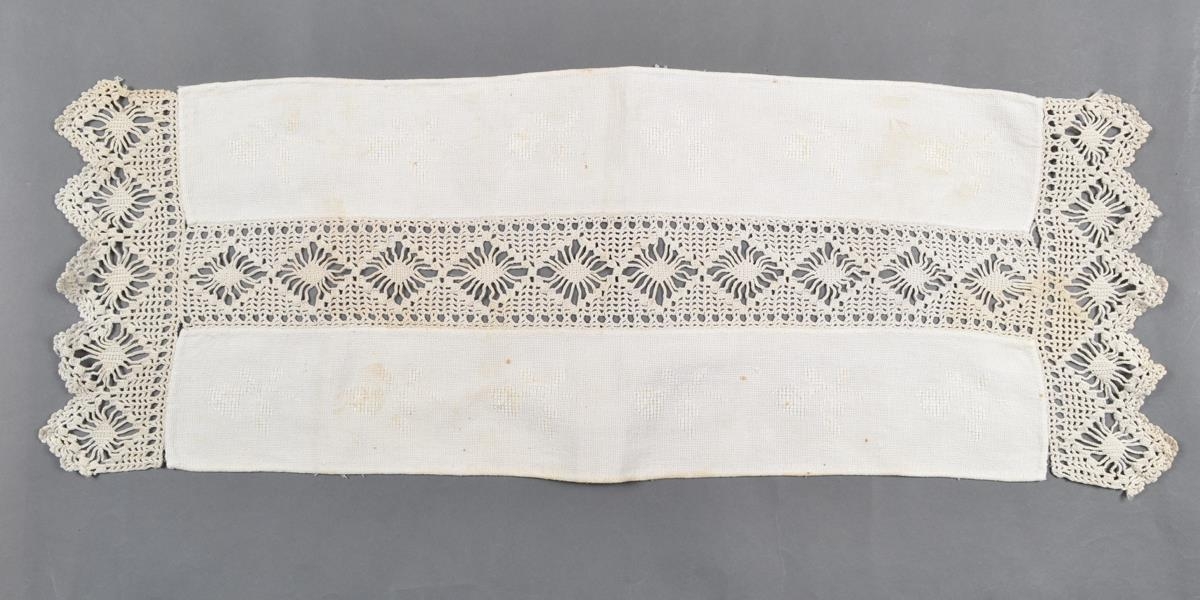 Dúkur úr ljósri grófri bómullareinskeftu með 9 cm breiðum hekluðum mynsturbekk fyfir miðju og á báðum endum úr bómullarbandi, einnig eru útsaumaðar rósir meðfram mynsturbekknum, ferhyrningslaga.