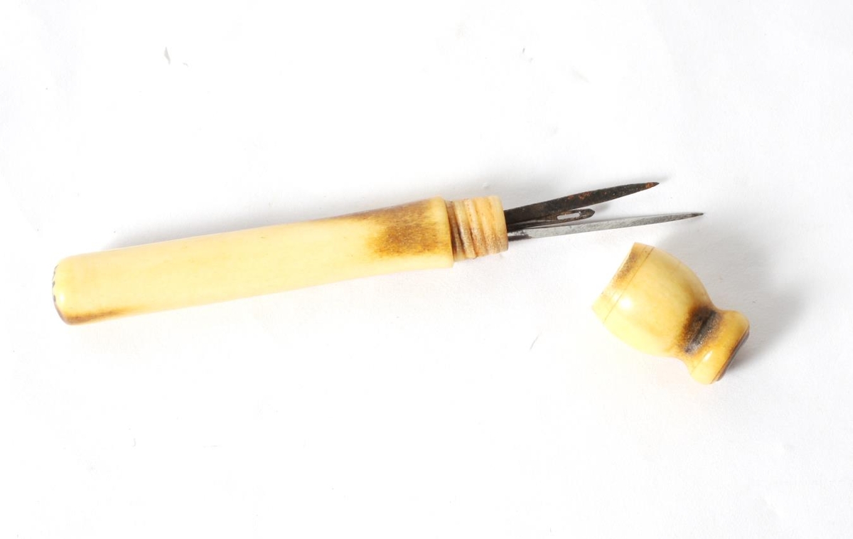 Rennt nálhús með hnöttóttu loki sem skrúfast ofaná. Brún rák er í miðju en það er vegna fitu í beininu. Líklega er þetta úr hrosslegg. Fjórar leðurnálar eru í húsinu. Frá Birni Benediktssyni á Tókastöðum.