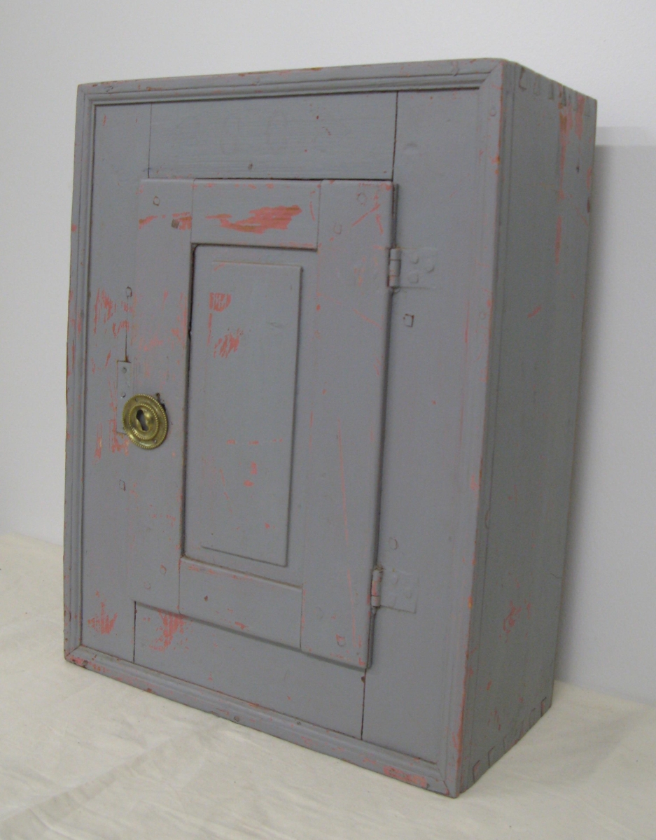 Grámálaður veggskápur með læsanlegri hurð. Frá Birni Benediktssyni frá Tókastöðum í Eiðaþinghá.