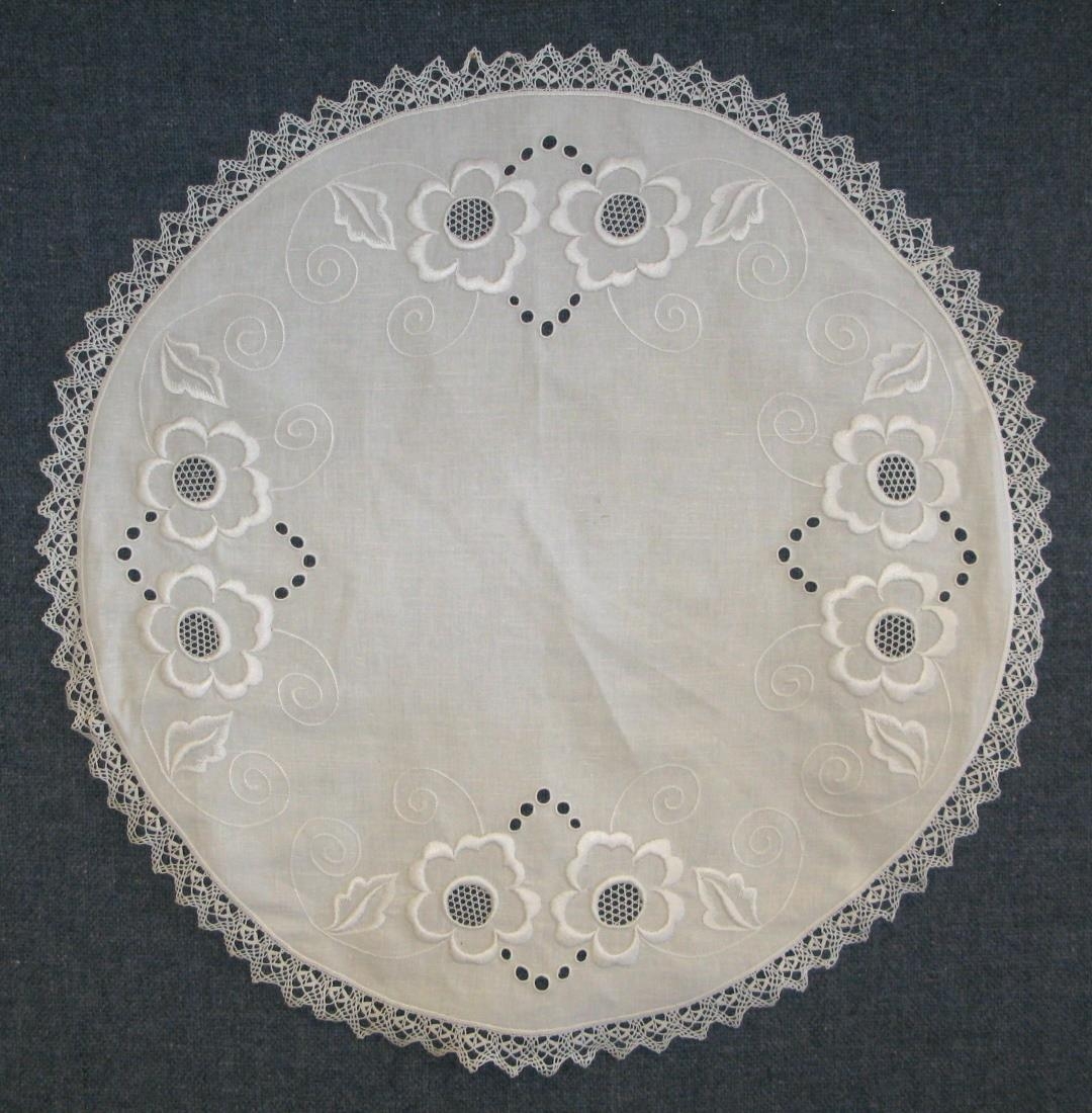 Hvíturkringlóttur mjög fallega útsaumaður dúkur með með gatamynstri og venisiönskum saum. Saumaður af Guðrúnu Sigurjónsdóttur (f. 01.10.1916, d. 09.10.1981).