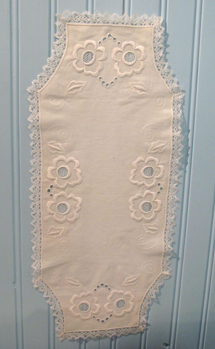 Hvítur dúkur, mjög fallega útsaumaður með gatamynstri og venisiönskum saum. Gerður af Guðrúnu Sigurjónsdóttur (f. 01.10.1916, d. 09.10.1981).