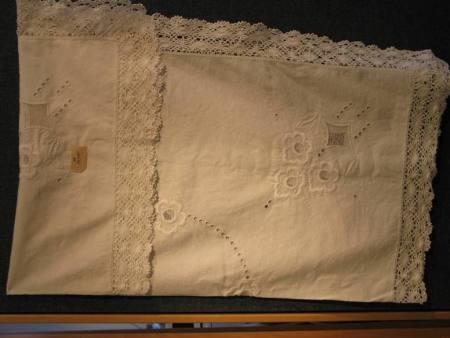 Hvítur dúkur, útsaumaður með gatamynstri og venisiönskum saum.