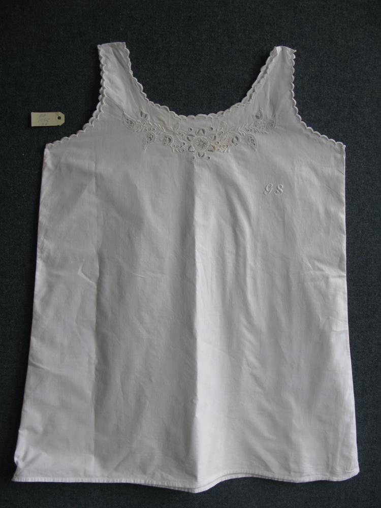 Hvítur undirkjóll mjög fallegur og vel gerður, merktur með stöfunum "G.S." sem saumaðir eru með flatsaum. Hálsmál og handakrikar er allir kappmellaðir í tungum. Kjóllinn er með smá blettum í munstri sem ekki hafa farið úr við þvott.
