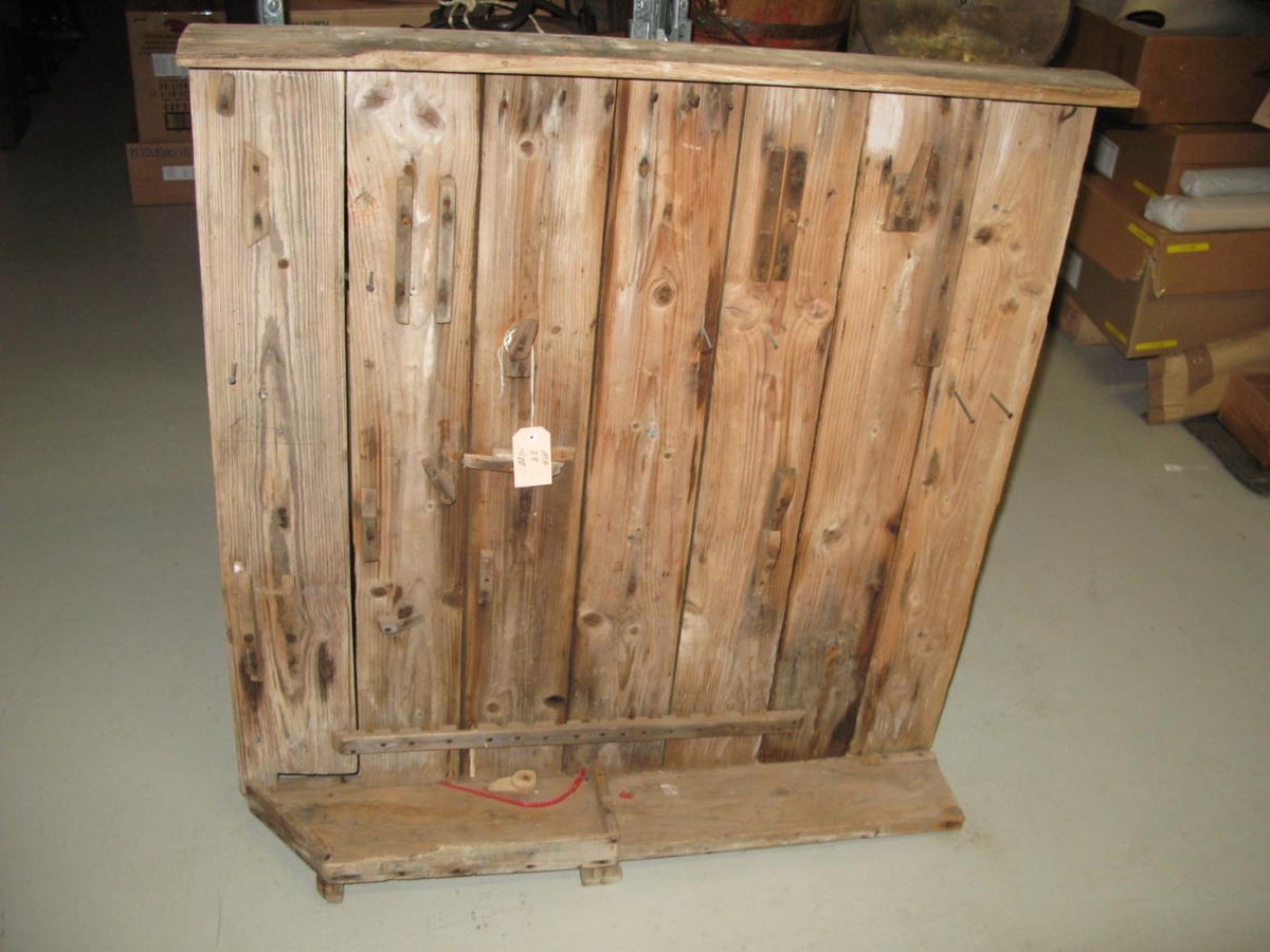Verkfæratafla úr 7 fjölum nótuðum saman, á henni eru tréhankar og hakar til að hengja verkfæri á. Tvær lausar fjalir frá. Taflan var í Friðheimi í Mjóafirði í útendanum niðri í kjallara og negld beint í steyptan vegg.
