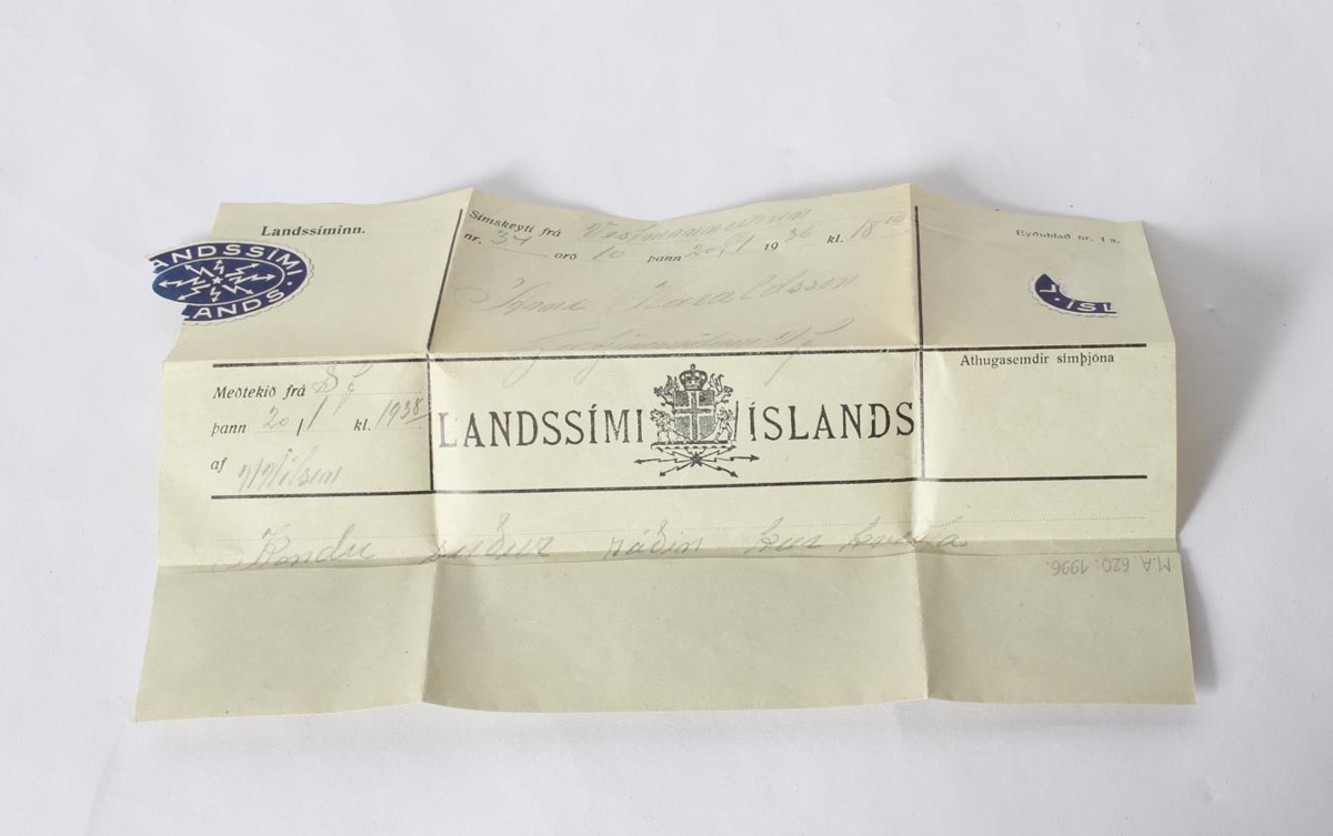 Skeyti til Árna Haraldssonar frá Vestmannaeyjum, frá því 20.01.1936. Svohljóðandi: "Komdu suður. Ráðinn. Kær kveðja. Regína". Úr eigu Árna Haraldssonar frá Tandrastöðum í Norðfirði.