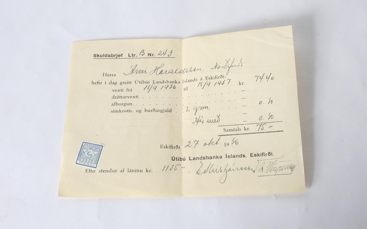 Skuldabréf Árna Haraldssonar við Landsbanka Íslands á Eskifirði 27.11.1936. Með álímdu greiðslumerki 10 aura. Úr eigu Árna Haraldssonar frá Tandrastöðum í Norðfirði.