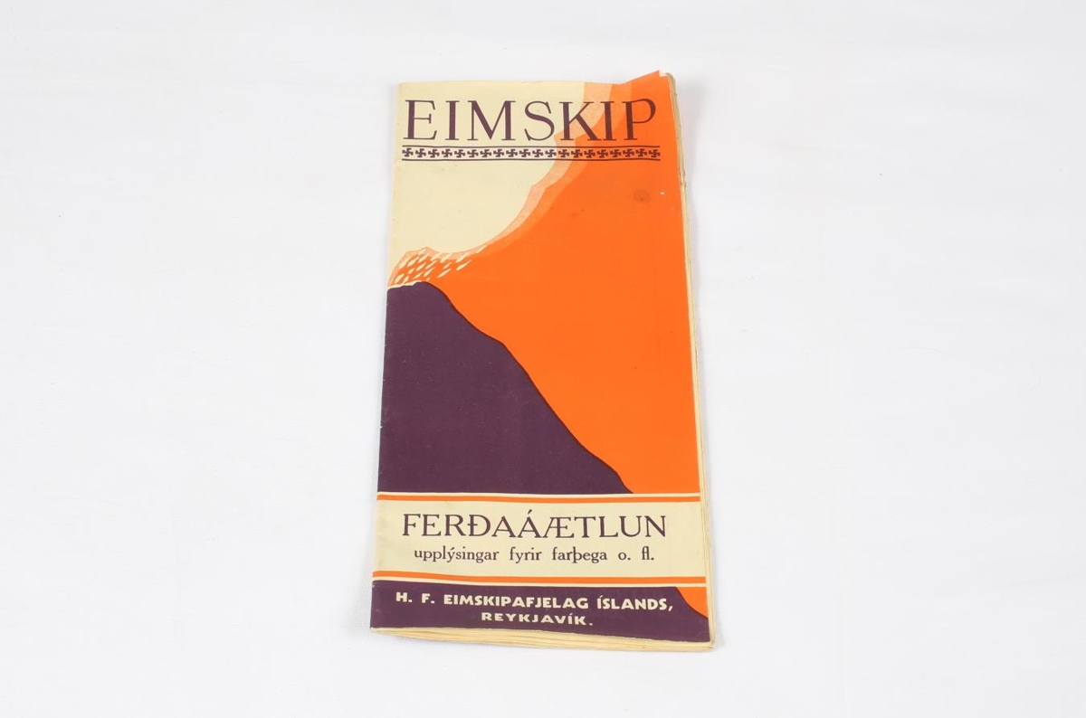 Ferðaáætlun Eimskipafélags Íslands frá 1933. Kápumynd af eldfjalli. Úr eigu Árna Haraldssonar frá Tandrastöðum í Norðfirði.