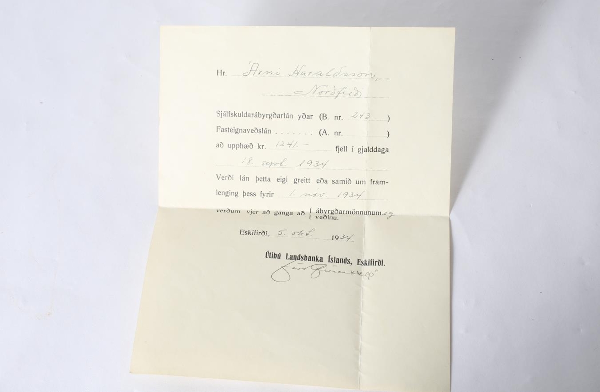 Tilkynning til Árna um að lán hans séu fallin í gjalddaga. Frá Landsbankanum á Eskifirði, dagsett 5.okt 1934. Úr eigu Árna Haraldssonar frá Tandrastöðum í Norðfirði.
