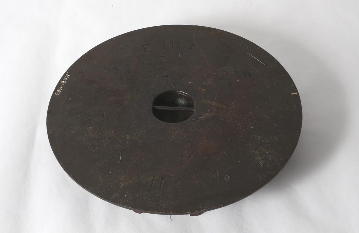Slétt hella með gróp í miðju til að taka hana upp úr eldavél og koma henni fyrir, tindar undir hellunni. Merkt "No1. Ank H." öðru megin á hringnum og á mótipartinum "F" (kóróna yfir því). No 1. Sett í staðinn fyrir hringi í eldavél til að hafa undir strauboltum.