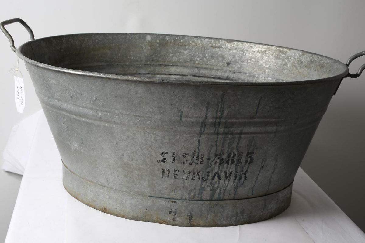 Þvottabali, eilítið ryðgaður og snjáður. Á annarri hlið hans stendur: SÍS/B-5815 Reykjavík. Úr eigu föður gefanda sem bjó á Grund í Reyðarfirði.