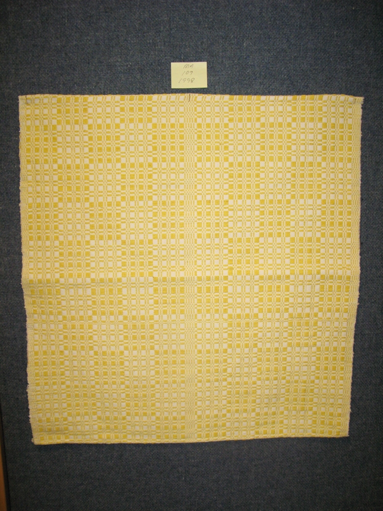 Gult og hvítt sýnishorn af salonsvefnaði. Kantar faldaðir. Handavinna Málfríðar Jónasdóttur frá Kolmúla í Reyðarfirði. Hún veiktist af heilahimnubólgu þegar hún var á tíunda aldursári og missti sjón og heyrn bilaði.