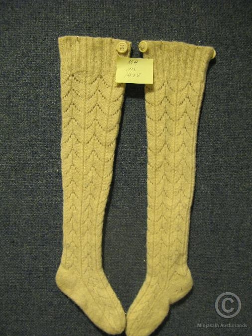 Hvítir háir útprjónaðir telpnasokkar úr eingirni. Tvær tölur efst á báðum til að hneppa í sokkaböndin. Handavinna Málfríðar Jónasdóttur frá Kolmúla í Reyðarfirði.